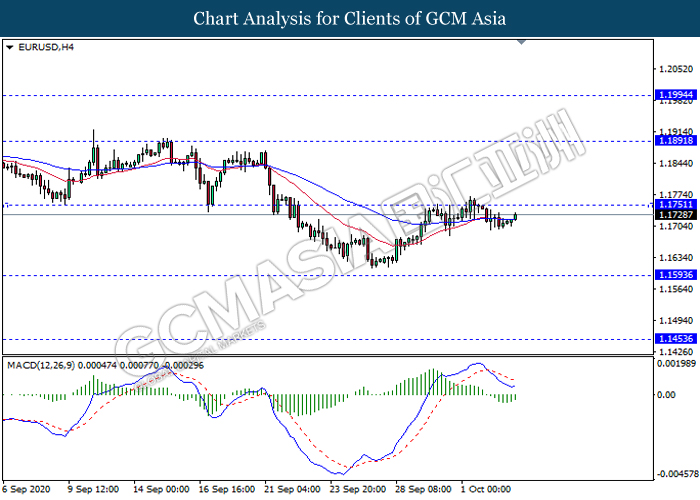 EURUSD, H4: EURUSD telah didagang dengan rata sementara ia sedang menguji berhampiran dengan tahap rintangan 1.1750. Namun, MACD yang memaparkan isyarat momentum bearish yang berkurangan mencadangkan pasangan ini untuk didagang dengan lebih tinggi selepas ia memecah tahap rintangan tersebut.