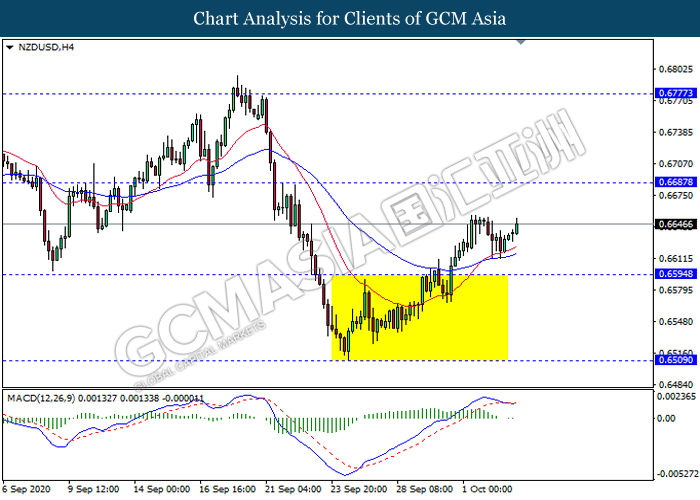 NZDUSD, H4: NZDUSD telah didagang dengan lebih tinggi susulan dengan lantunan dari garisan MA. MACD yang memaparkan isyarat bias bullish mencadangkan pasangan ini untuk melanjutkan keuntungannya ke arah tahap rintangan 0.6685.