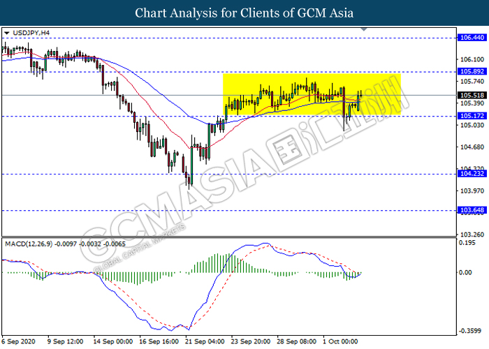 USDJPY, H4: USDJPY kekal didagang dalam saluran sisi susulan dengan lantunan dari tahap sokongan 105.15 baru-baru ini. Namun, MACD yang memaparkan isyarat momentum bearish mencadangkan pasangan ini untuk melanjutkan lantunannya dalam jangka pendek ke arah tahap rintangan 105.90.
