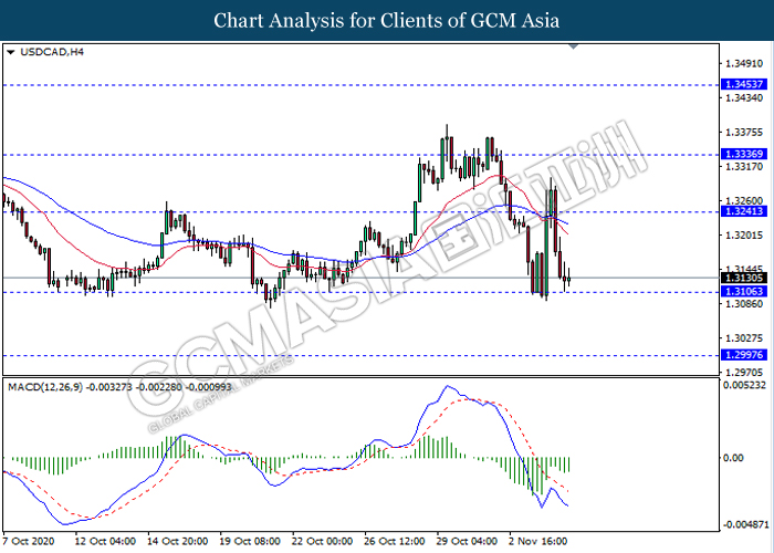 USDCAD, H4: USDCAD telah didagang dengan lebih rendah sementara ia sedang menguji tahap sokongan 1.3105. MACD yang memaparkan isyarat momentum bearish yang beterusan mencadangkan pasangan ini untuk melanjutkan kerugiannya selepas ia memecah tahap sokongan tersebut.