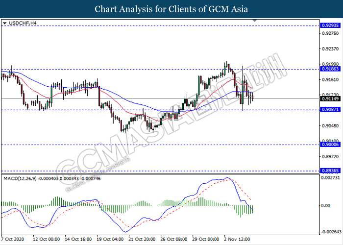 USDCHF, H4: USDCHF telah didagang dengan lebih rendah sementara ia sedang menguji berhampiran dengan tahap sokongan 0.9085. MACD yang memaparkan isyarat bias bearish mencadangkan pasangan ini untuk melanjutkan kerugiannya selepas ia memecah tahap sokongan tersebut.
