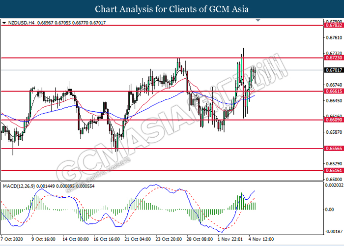 NZDUSD, H4: NZDUSD telah didagang dengan lebih tinggi susulan dengan pemecahan pada tahap sokongan sebelumnya 0.6660. MACD yang memaparkan isyarat momentum bullish yang berterusan mencadangkan pasangan ini untuk melanjutkan keuntungannya ke arah tahap rintangan 0.6725.