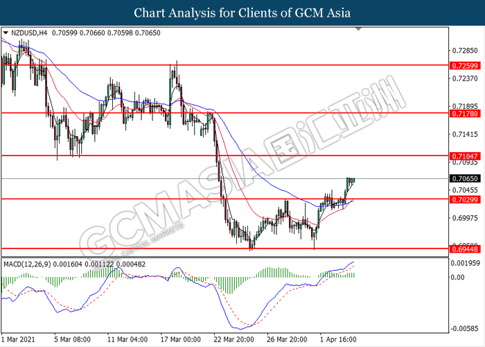 NZDUSD, H4: NZDUSD telah didagang dengan lebih tinggi selepas ia memecah tahap rintangan sebelumnya di 0.7030. MACD yang menunjukkan isyarat momentum bullish yang berterusan mencadangkan pasangan ini untuk melanjutkan keuntungannya dan menuju ke arah tahap rintangan di 0.7105.