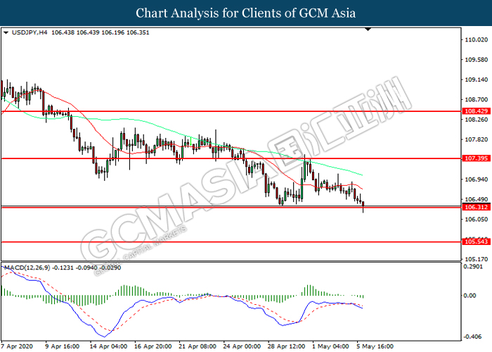 USDJPY, H4: USDJPY telah didagang dengan lebih rendah sementara kini menguji di tahap sokongan 106.30. MACD yang memaparkan momentum bearish mencadangkan pasangan ini untuk melanjutkan kerugiannya selepas ia memecah tahap sokongan tersebut.