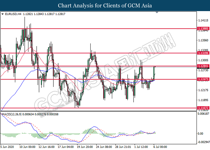 EURUSD, H4: EURUSD telah didagang dengan lebih tinggi sementara ia sedang menguji tahap rintangan di 1.1285. MACD yang memaparkan momentum bullish yang berterusan mencadangkan pasangan ini untuk melanjutkan keuntungannya selepas ia berjaya memecah tahap rintangan tersebut.