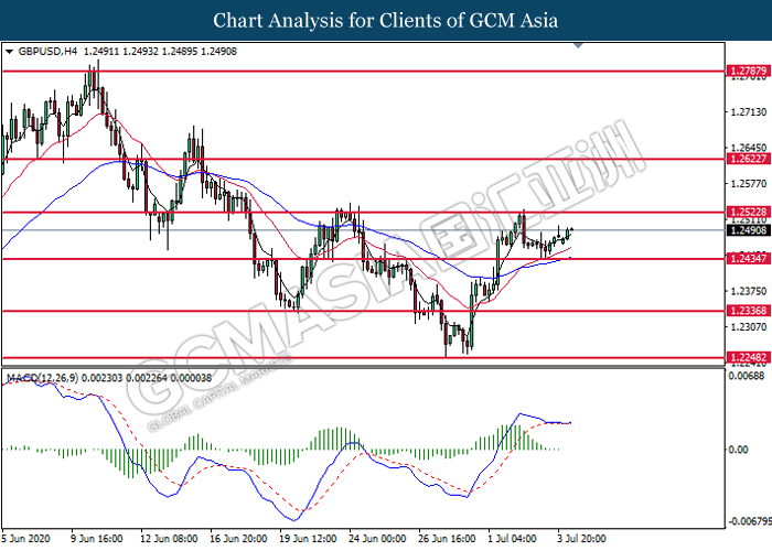 GBPUSD, H4: GBPUSD telah didagang dengan lebih tinggi selepas ia melantun dari tahap sokongan di 1.2435. Oleh sebab kekurangan isyarat daripada MACD, ia dicadangkan untuk menunggu lebih isyarat sebelum memasuki ke pasaran.