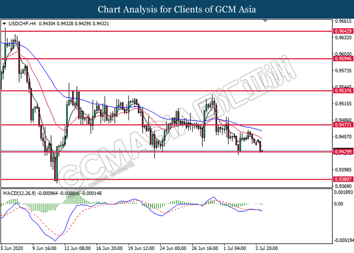 USDCHF, H4: USDCHF telah didagang dengan lebih rendah sementara ia sedang menguji tahap sokongan di 0.9430. MACD yang memaparkan momentum bearish yang berterusan mencadangkan pasangan ini untuk melanjutkan kerugiannya selepas ia memecah tahap sokongan di 0.9430.