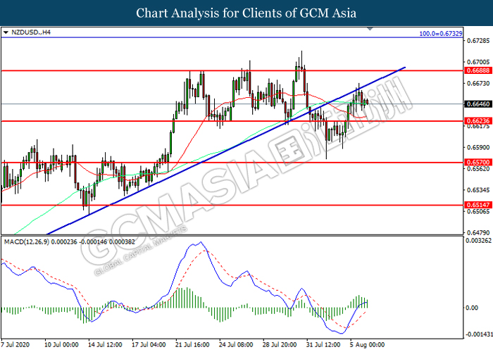 NZDUSD, H4: NZDUSD telah didagang dengan lebih rendah selepas ia berundur dari garisan trend menaik. MACD yang memaparkan momentum bullish yang berkurangan mencadangkan pasangan ini untuk melanjutkan kerugiannya ke arah tahap sokongan 0.6625.