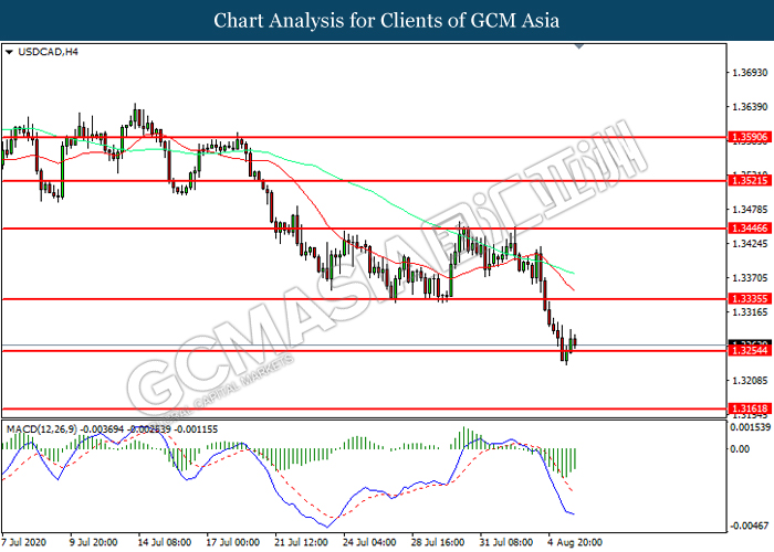 USDCAD, H4: USDCAD telah didagang dengan lebih tinggi selepas ia melantun dari tahap sokongan 1.3255. MACD yang memaparkan momentum bearish yang berkurangan mencadangkan pasangan ini untuk melanjutkan keuntungannya ke arah tahap rintangan 1.3335.