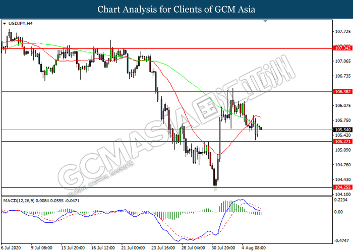 USDJPY, H4: USDJPY telah didagang dengan lebih rendah sementara kini berhampiran dengan tahap sokongan 105.25. Namun, MACD yang memaparkan momentum bearish yang berkurangan mencadangkan pasangan ini untuk mengalami pembetulan teknikal bagi jangka pendek.