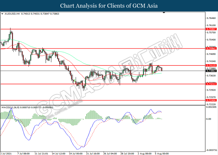 AUDUSD, H4: AUDUSD telah didagang dengan lebih rendah selepas ia berundur dari tahap rintangan 0.7410. MACD yang memaparkan momentum bearish mencadangkan pasangan ini untuk melanjutkan kerugiannya ke arah tahap sokongan 0.7320.