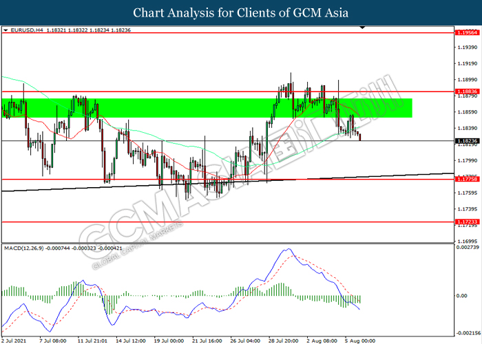 EURUSD, H4: EURUSD telah didagang dengan lebih rendah selepas ia berundur dari tahap rintangan 1.1885. MACD yang memaparkan momentum bearish mencadangkan pasangan ini untuk melanjutkan kerugiannya ke arah tahap sokongan 1.1775.