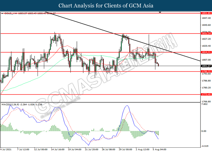 GOLD_, H4: Harga emas telah didagang dengan lebih rendah selepas ia memecah tahap sokongan terdahulu 1814.25. MACD yang memaparkan momentum bearish mencadangkan komoditi ini untuk melanjutkan kerugiannya ke arah tahap sokongan 1795.70.