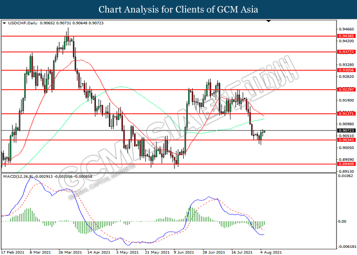 USDCHF, Daily: USDCHF telah didagang dengan lebih rendah sementara kini menguji di tahap sokongan 0.9035. Namun, MACD yang memaparkan momentum bearish yang berkurangan mencadangkan pasangan ini untuk mengalami pembetulan teknikal bagi jangka pendek.