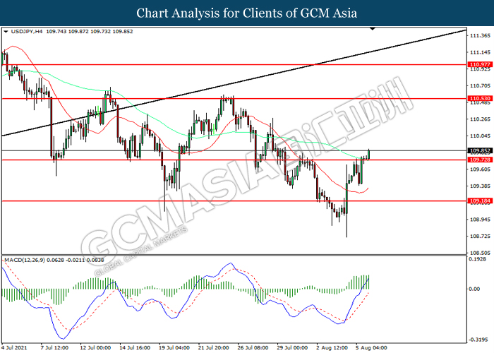 USDJPY, H4: USDJPY telah didagang dengan lebih tinggi selepas ia memecah tahap rintangan terdahulu 109.75. MACD yang memaparkan momentum bullish mencadangkan pasangan ini untuk melanjutkan keuntungannya ke arah tahap rintangan 110.55.