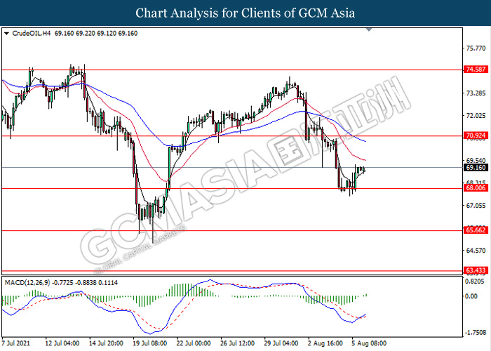 CrudeOIL, H4: Harga minyak mentah telah didagang dengan lebih tinggi susulan dengan lantunan dari tahap sokongan 68.00. MACD yang memaparkan isyarat momentum bullish dengan formasi silang emas mencadangkan komoditi ini untuk melanjutkan lantunannya ke arah tahap rintangan 70.90.