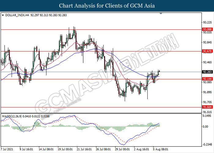 DOLLAR_INDX, H4: Indeks dolar telah didagang dengan lebih tinggi susulan dengan lantunan dari tahap sokongan 92.15. MACD yang memaparkan isyarat bias bullish mencadangkan dolar untuk melanjutkan keuntungannya ke arah tahap rintangan 92.65.