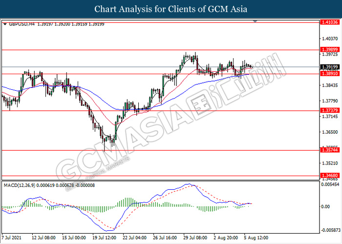 GBPUSD, H4: GBPUSD telah didagang dengan rata sementara ia sedang menguji berhampiran dengan tahap sokongan 1.3890. Namun, MACD yang memaparkan isyarat bias bearish mencadangkan pasangan ini untuk didagang dengan lebih rendah selepas ia memecah tahap sokongan tersebut.