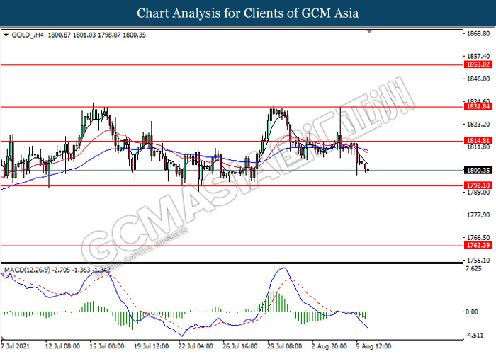 GOLD_, H4: Harga emas telah didagang dengan lebih rendah sementara ia sedang menguji berhampiran dengan tahap sokongan 1792.10. MACD yang memaparkan isyarat momentum bearish mencadangkan komoditi ini untuk melanjutkan kerugiannya selepas ia memecah tahap sokongan tersebut.