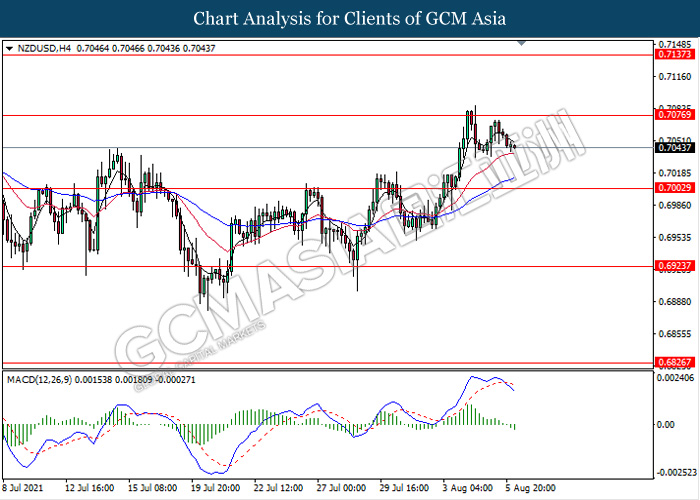 NZDUSD, H4: NZDUSD telah didagang dengan lebih rendah susulan dengan pengunduran dari tahap rintangan 0.7075. MACD yang memaparkan isyarat momentum bearish dengan formasi silang kematian mencadangkan pasangan ini untuk melanjutkan pengundurannya ke arah tahap sokongan 0.7000.