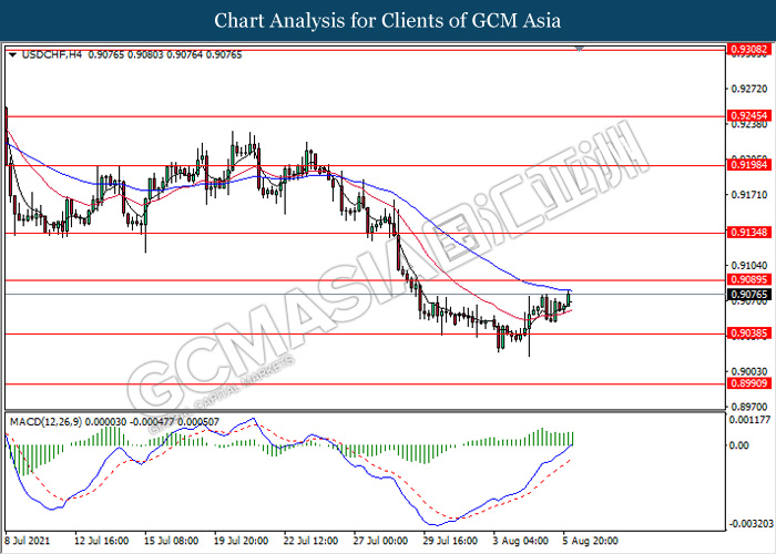 USDCHF, H4: USDCHF telah didagang dengan lebih tinggi sementara ia sedang menguji berhampiran dengan tahap rintangan 0.9090. MACD yang memaparkan isyarat momentum bullish mencadangkan pasangan ini untuk melanjutkan keuntungannya selepas ia memecah tahap rintangan tersebut.