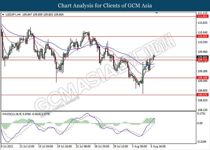 USDJPY, H4: USDJPY telah didagang dengan lebih tinggi susulan dengan pemecahan pada tahap rintangan sebelumnya 109.70. MACD yang memaparkan isyarat momentum bullish mencadangkan pasangan ini untuk melanjutkan keuntungannya ke arah tahap rintangan 110.40.