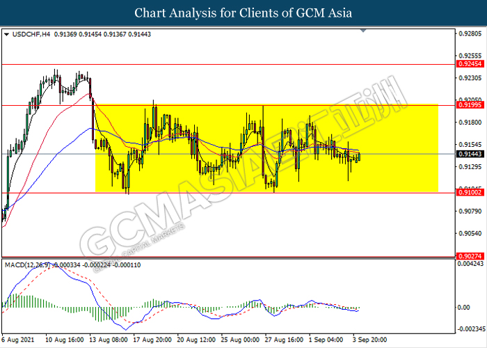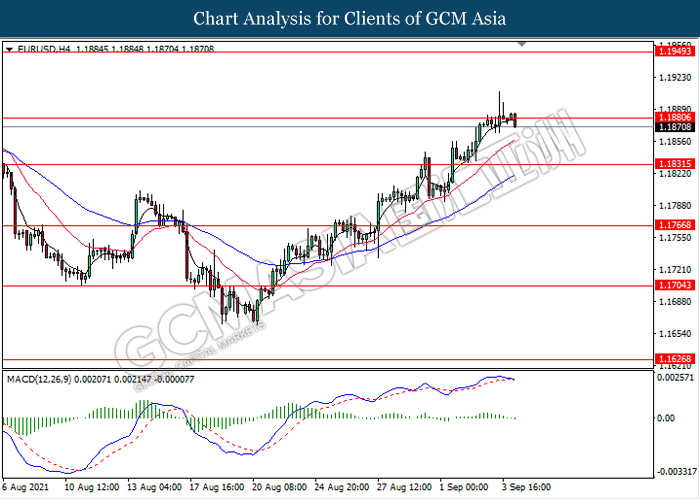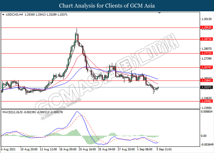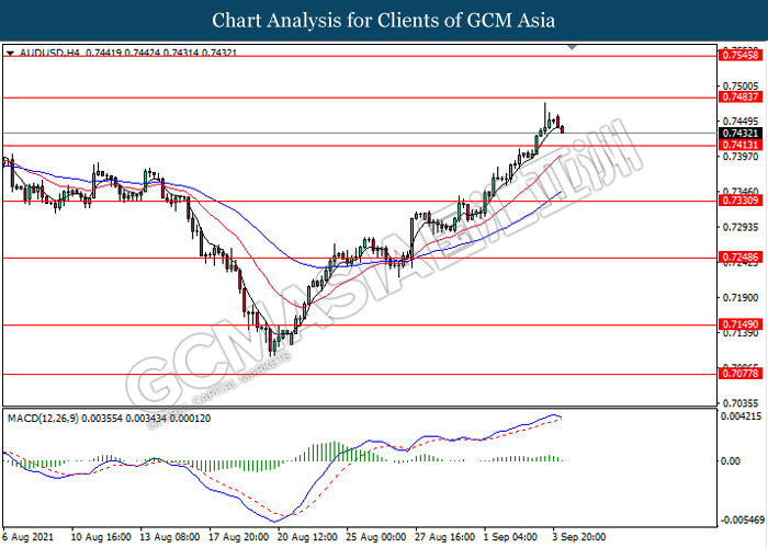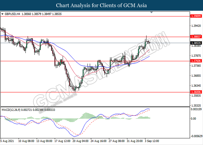 GBPUSD, H4: GBPUSD was traded lower following prior retracement from the Tahap rintangan 1.3885. MACD which illustrate diminishing bullish momentum signal suggest the pair to extend its retracement from the Tahap rintangan 1.3885.