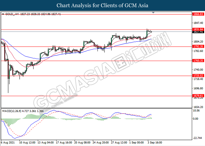 GOLD, H4: Harga emas telah didagang dengan lebih tinggi sementara ia sedang menguji tahap rintangan 1831.85. MACD yang memaparkan isyarat momentum bullish mencadangkan komoditi ini untuk melanjutkan keuntungannya selepas ia memecah tahap rintangan tersebut.