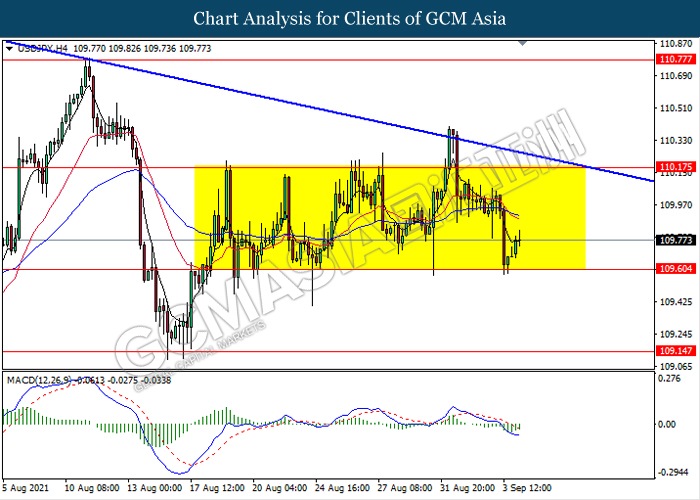 USDJPY, H4: USDJPY kekal didagang dalam saluran sisi susulan dengan lantunan dari tahap sokongan 109.60. Namun, MACD yang memaparkan isyarat momentum bearish yang berkurangan mencadangkan pasangan ini untuk melanjutkan lantunannya dalam jangka ke arah tahap rintangan 110.15.