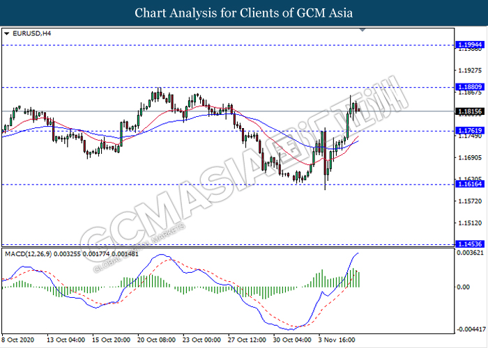 EURUSD, H4: EURUSD telah didagang dengan lebih tinggi susulan dengan pemecahan pada tahap rintangan sebelumnya 1.1760. Namun, MACD yang memaparkan isyarat momentum bullish yang telah berkurangan mencadangkan pasangan ini untuk mengalami pembetulan teknikal jangka pendek ke arah tahap sokongan 1.1760.
