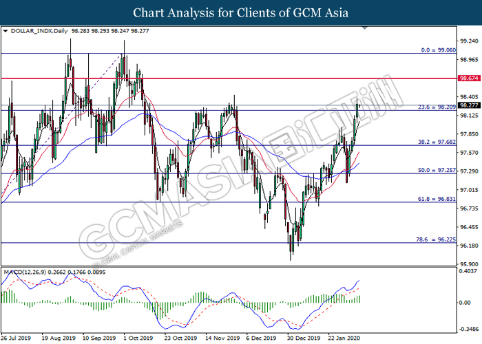 Dolar AS yang berbanding dengan sebakul enam pasangan mata wang utama kekal teguh semasa lewat sesi Asia sementara pasaran menunggu untuk data NFP yang akan datang. Data baru-baru ini dari A.S. dan langkah rangsangan China kekal memberi sedikit kelegaan kepada pasaran. Walau bagaimanapun, pasaran tetap berhati-hati kerana wabak koronavirus yang berterusan terus menimbang di pasaran. Jumlah kematian telah melepasi 600 manakala jumlah yang dijangkiti juga melonjak kepada lebih daripada 30000. Ketidakpastian mengenai kesan koronovirus terhadap pertumbuhan global kekal menyebabkan para pelabur untuk berwaspada. Namun, sentimen pasaran juga disokong oleh rangsangan bank pusat dan pengumuman China dalam pengurangan tarif pada import A.S. Para pelabur kini akan memberi tumpuan kepada NFP untuk mendapat pengesahan selanjutnya untuk arah aliran. Semasa penulisan, indeks dolar telah meningkat sebanyak 0.02% kepada 98.45.