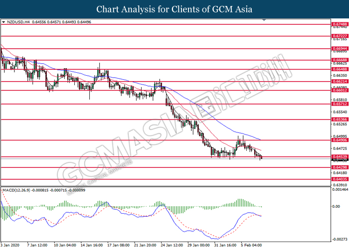 NZDUSD, H4: NZDUSD telah didagang dengan lebih rendah sementara ia sedang menguji tahap sokongan di 0.6455. MACD yang memaparkan isyarat momentum bearish mencadangkan pasangan ini untuk melanjutkan kerugiannya selepas ia memecah tahap sokongan tersebut.
