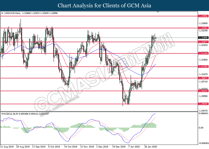USDCAD, Daily: USDCAD telah didagang dengan lebih tinggi selepas ia memecah tahap rintangan sebelumnya di 1.3265. Namun, MACD yang memaparkan penyusutan pada momentum menaik mencadangkan pasangan ini untuk didagang dengan lebih rendah bagi jangka pendek sebagai pembetulan teknikal.