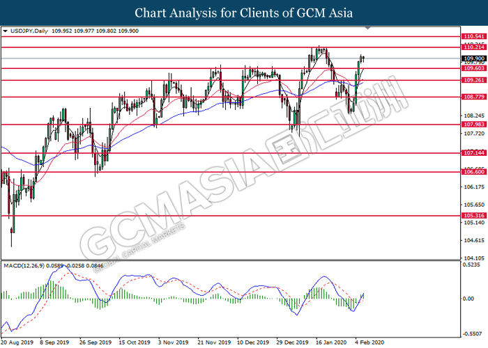USDJPY, Daily: USDJPY telah didagang dengan lebih tinggi selepas ia memecah tahap rintangan sebelumnya di 109.60. MACD yang memaparkan isyarat momentum bias bullish mencadangkan pasangan ini untuk meningkat dan menuju ke arah tahap rintangan di 110.20.