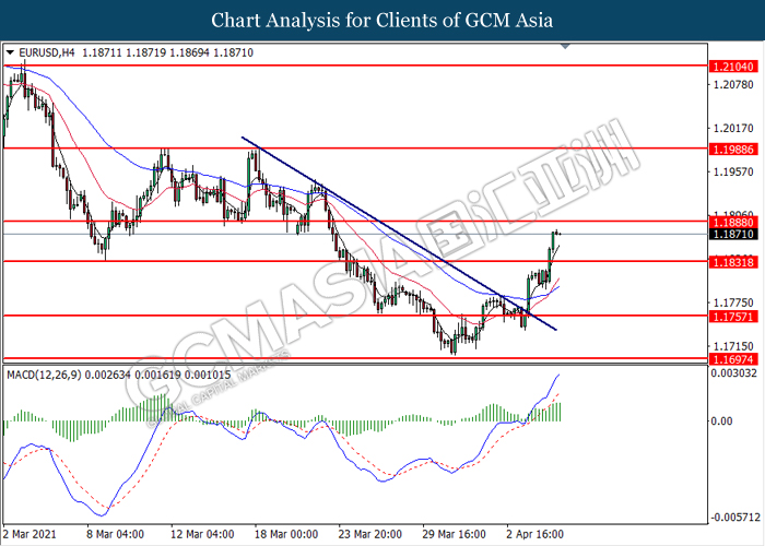 EURUSD, H4: EURUSD telah didagang dengan lebih tinggi selepas ia memecah tahap rintangan sebelumnya di 1.1830. MACD yang memaparkan momentum bullish yang berterusan mencadangkan pasangan ini untuk melanjutkan keuntungannya dan menuju ke arah tahap rintangan di 1.1880.