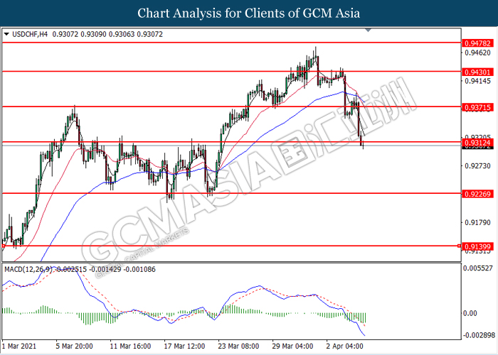 USDCHF, H4: USDCHF telah didagang dengan lebih rendah selepas ia memecah tahap sokongan sebelumnya di 0.9310. MACD yang menunjukkan isyarat momentum bearish yang berterusan mencadangkan pasangan ini untuk melanjutkan kerugiannya dan menuju ke arah tahap sokongan di 0.9225.