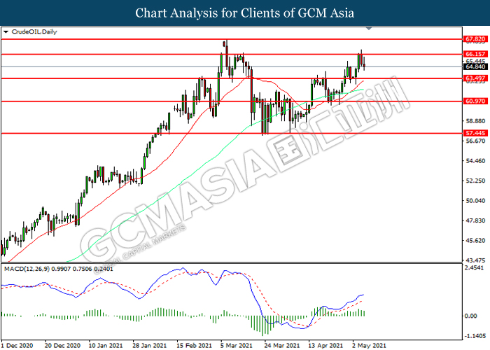 Bagi pasaran komoditi, harga minyak mentah telah menyusut sebanyak 0.11% ke $64.90 se tong semasa penulisan. Pasaran minyak mentah telah didagang dengan lebih rendah susulan dengan peningkatan kes-kes Covid-19 yang ketara di negara India telah mencetuskan prospek negatif ke atas permintaan minyak mentah. Sebaliknya, harga emas telah meningkat sebanyak 0.03% ke $1814.70 se troy auns semasa penulisan susulan dengan para pelabur khuatir terhadap risiko inflasi pada masa yang akan datang, yang mendorong mereka untuk mengalihkan pelaburan ke aset selamat emas untuk melindungi risiko inflasi.
