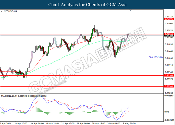 NZDUSD, H4: NZDUSD telah didagang dengan lebih tinggi sementara kini menguji di tahap rintangan 0.7235. MACD yang memaparkan momentum bullish mencadangkan pasangan ini untuk melanjutkan keuntungannya selepas ia memecah tahap rintangan tersebut.