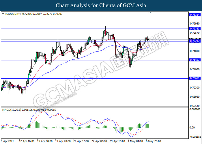 NZDUSD, H4: NZDUSD telah didagang dengan lebih tinggi susulan dengan pemecahan pada tahap rintangan sebelumnya 0.7220. Namun, MACD yang memaparkan isyarat momentum bullish yang berkurangan mencadangkan pasangan ini untuk didagang dengan lebih rendah selepas ia memecah kembali ke bawah tahap tersebut.