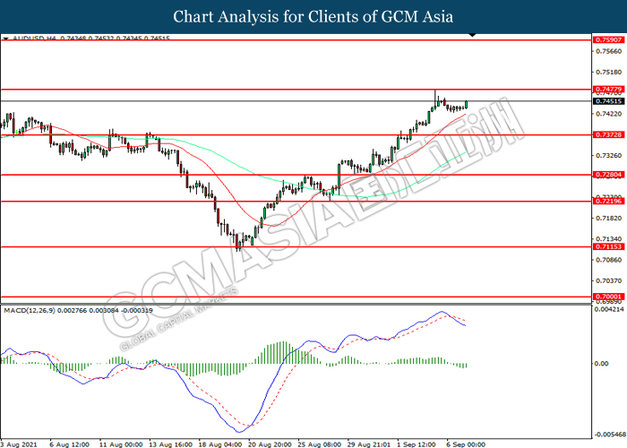 AUDUSD, H4: AUDUSD telah didagang dengan lebih tinggi selepas ia memecah tahap rintangan terdahulu 0.7375. MACD yang memaparkan momentum bearish yang berkurangan mencadangkan pasangan ini untuk melanjutkan keuntungannya selepas ia memecah tahap rintangan tersebut.