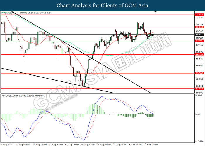 CrudeOIL, H4: Harga minyak mentah telah didagang dengan lebih rendah selepas ia memecah tahap sokongan terdahulu 69.85. Namun, MACD yang memaparkan momentum bearish yang berkurangan mencadangkan komoditi ini untuk mengalami pembetulan teknikal bagi jangka pendek.