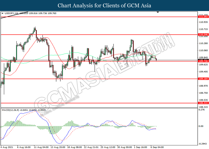 USDJPY, H4: USDJPY telah didagang dengan lebih rendah sementara kini menguji di tahap sokongan 109.75. Namun, MACD yang memaparkan momentum bearish yang berkurangan mencadangkan pasangan ini untuk mengalami pembetulan teknikal bagi jangka pendek.
