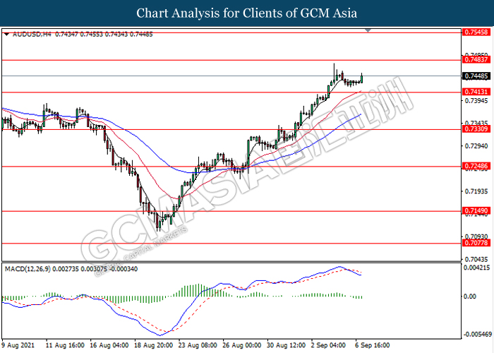 AUDUSD, H4: AUDUSD telah didagang dengan lebih tinggi susulan dengan lantunan dari paras rendahnya. MACD yang memaparkan isyarat momentum bearish yang berkurangan mencadangkan pasangan ini untuk melanjutkan lantunannya ke arah tahap rintangan 0.7485.