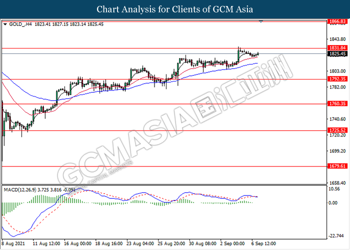 GOLD, H4: Harga emas telah didagang dengan lebih tinggi sementara ia sedang menguji berhampiran dengan tahap rintangan 1831.85. Namun, MACD yang memaparkan isyarat bias bearish dengan formasi silang kematian mencadangkan komoditi ini untuk didagang dengan lebih rendah sebagai pembetulan teknikal ke arah tahap sokongan 1792.35.