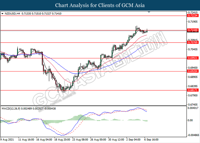 NZDUSD, H4: NZDUSD telah didagang dengan rata sementara ia sedang menguji tahap rintangan 0.7145. Namun, MACD yang memaparkan isyarat momentum bearish mencadangkan pasangan ini untuk didagang dengan lebih rendah ke arah tahap sokongan 0.7075.