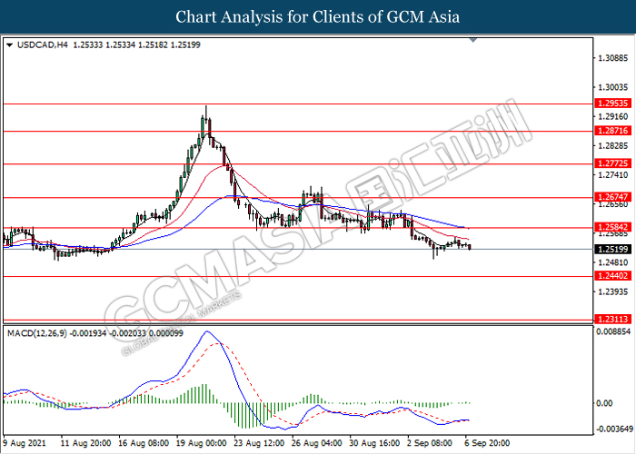 USDCAD, H4: USDCAD telah didagang dengan lebih rendah susulan dengan pengunduran dari paras tingginya baru-baru ini. MACD yang memaparkan isyarat momentum bullish yang berkurangan mencadangkan pasangan ini untuk melanjutkan kerugiannya ke arah tahap sokongan 1.2440.