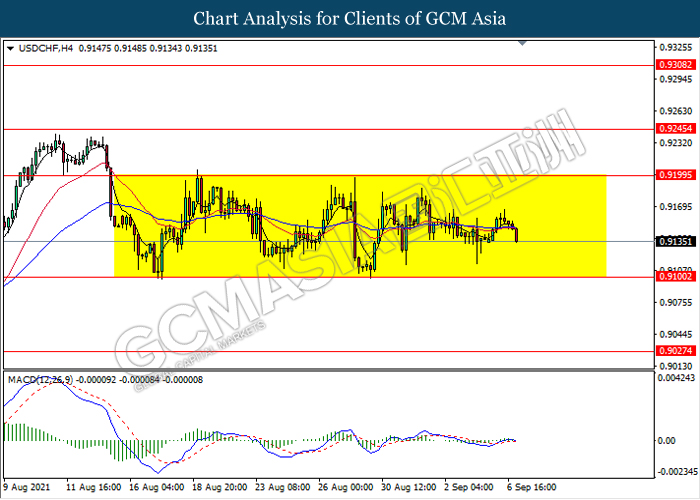USDCHF, H4: USDCHF kekal didagang dalam saluran sisi. Namun, MACD yang memaparkan isyarat momentum bearish mencadangkan pasangan ini untuk didagang dengan lebih rendah dalam jangka pendek ke arah tahap sokongan 0.9100.