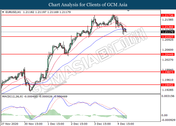 EURUSD, H1: EURUSD telah didagang dengan lebih rendah selepas ia berundur dari tahap rintangan di 1.2135. MACD yang memaparkan isyarat momentum bearish yang berterusan mencadangkan pasangan ini untuk melanjutka kerugiannya dan menuju ke arah tahap sokongan di 1.2105.