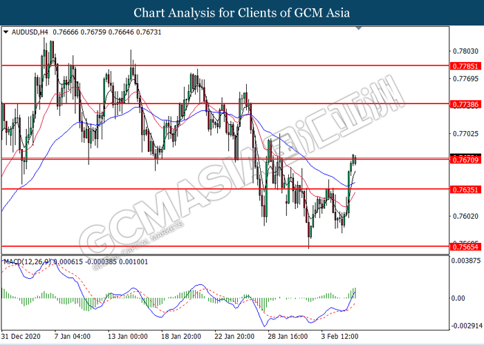 AUDUSD, H4: AUDUSD telah didagang dengan lebih tinggi sementara ia sedang menguji tahap rintangan di 0.7670. MACD yang memaparkan momentum bullish yang berterusan mencadangkan pasangan ini untuk melanjutkan keuntungannya selepas ia berjaya memecah tahap rintangan tersebut.
