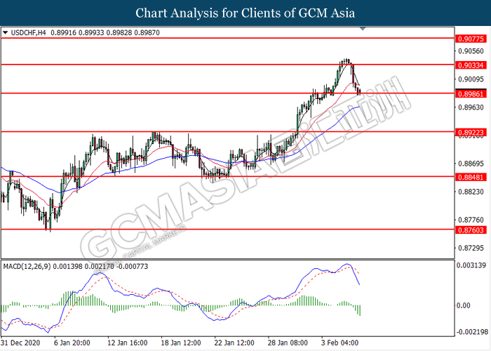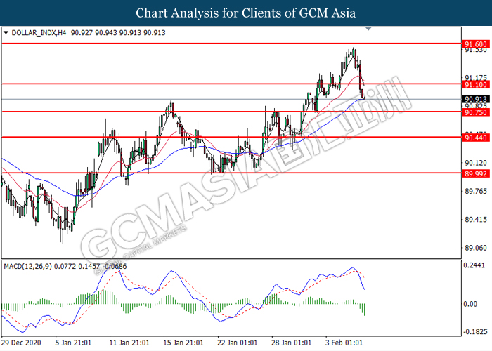 Indeks dolar yang mengukur nilainya berbanding sekumpulan enam mata wang utama menjunam selepas AS melaporkan serangkaian data yang bercampur pada Jumaat lalu. Menurut kepada Biro Statistik Tenaga Kerja, Laporan Nonfarm AS meningkat dari bacaan sebelumnya di -227K ke 49K, tetapi masih sedikit lebih lemah daripada ramalan ekonomi pada 50K, kerana kawalan pergerakan negara yang berterusan menyebabkan kerosakan besar terhadap industri perhotelan di mana kerajaan memaksa hotel , bar dan restoran tutup untuk mengekang penyebaran Covid-19. Selain itu, data Pengangguran AS dibebaskan pada 6.3%, jauh lebih rendah daripada bacaan yang diramalkan pada 6.7%, menunjukkan beberapa tanda pemulihan di pasaran buruh AS sambil menandakan penurunan dalam kadar pengangguran pada bulan pertama tahun 2021. Sebaliknya, kemajuan positif dalam pelan rangsangan AS juga telah mendorong tekanan jual yang ketara di pasaran dolar. Pada Jumaat lalu, Senat AS meluluskan resolusi belanjawan dimana membenarkan Demokrat untuk meluluskan bantuan coronavirus bernilai $ 1.9 trilion tanpa sokongan daripada Parti Republik. Pakej ini merangkumi cek rangsangan $ 1.400, faedah pengangguran tambahan dan dana untuk vaksin dan ujian COVID-19. Selain itu, Presiden AS Joe Biden juga memperingatkan bahawa usaha Republik untuk meluluskan rang undang-undang yang lebih kecil hanya akan memperpanjangkan masa untuk menuju ke pemulihan ekonomi. Semasa sesi dagangan Asia, indeks dolar turun 0.15% ke 90.90.